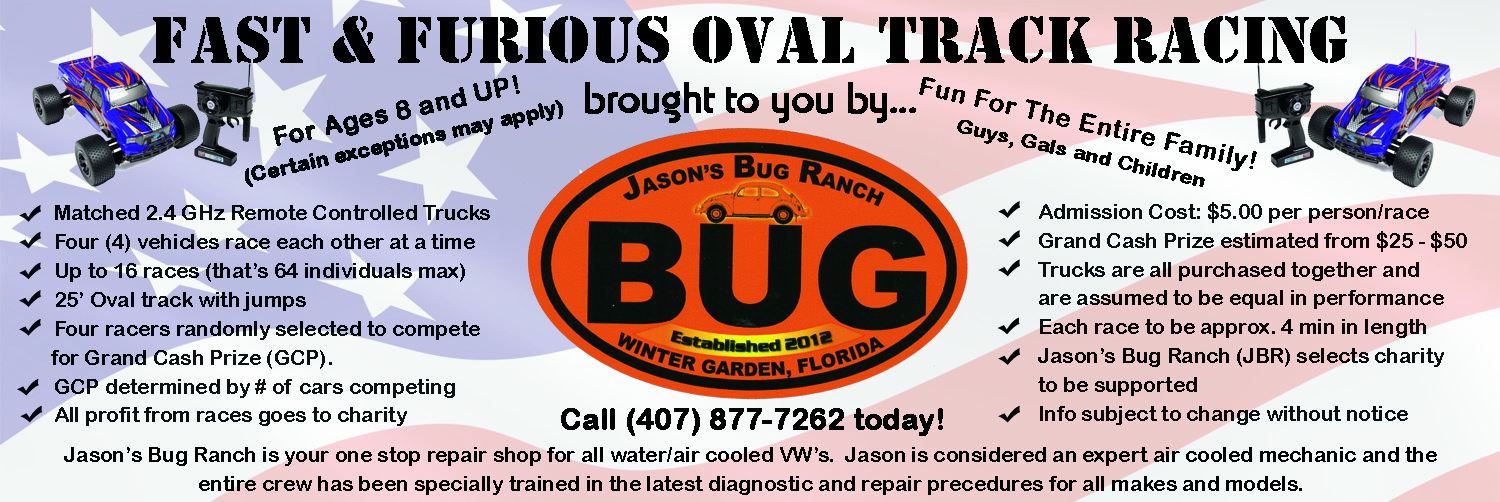 Going to be a great show again this year at The Lakeland VW Classic in Lakeland, FL on March 19 & 20.. We have teamed up with Jason's Bug Ranch in Winter Garden Fl to put on some RC Oval Track Races for charity. (Jason's is a full service repair shop for all your air and water cooled VW's and offers the friendliest service in the area.) We have 8 matched RC trucks and will be able to run up to 32 racers on Saturday and 64+ racers on Sunday. There will be a cash prize for the final winners plus a trophy on Sunday. This should be crazy and a whole lot of fun. And don't forget that we will be having the Fast & Furious Matchbox Drag Races for the children with free cars for those who participate. See you there...
